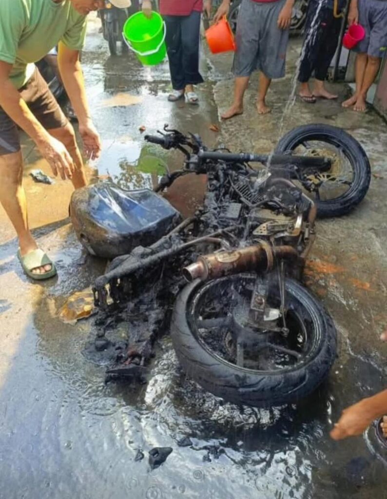 “Pas dia balik ke rumah, tiba-tiba muncul percikan api dan motornya langsung terbakar,” kata salah satu warga.