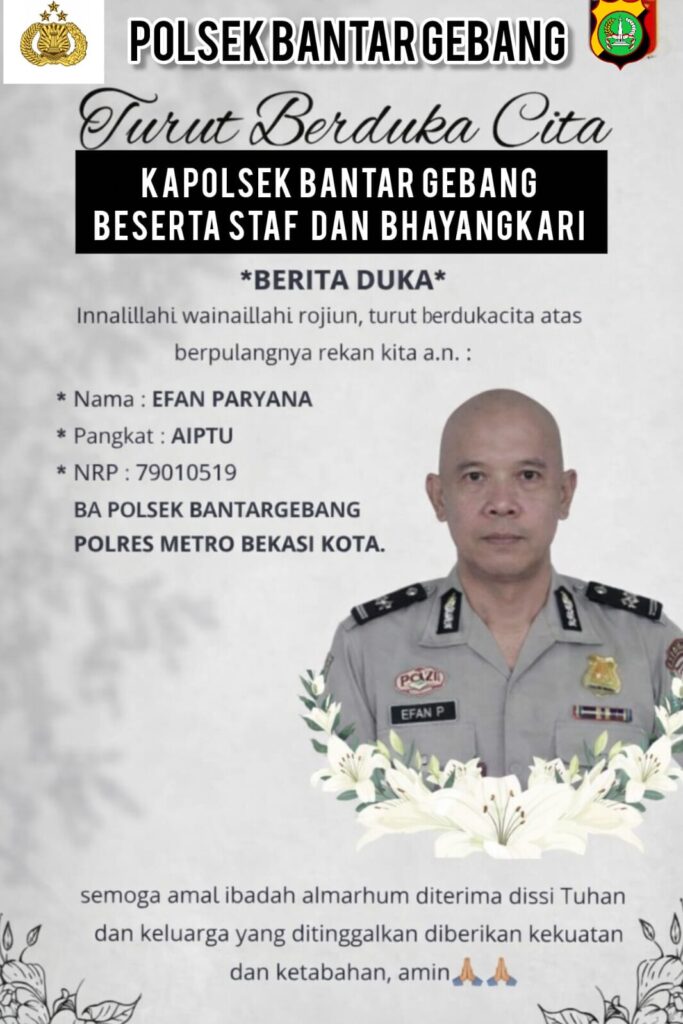 Bekasi – Kabar duka menyelimuti jajaran Kepolisian Resor Metro Bekasi Kota, khususnya Polsek Bantargebang. Salah satu personel dedikatif, Aiptu Efan Paryana, meninggal dunia.