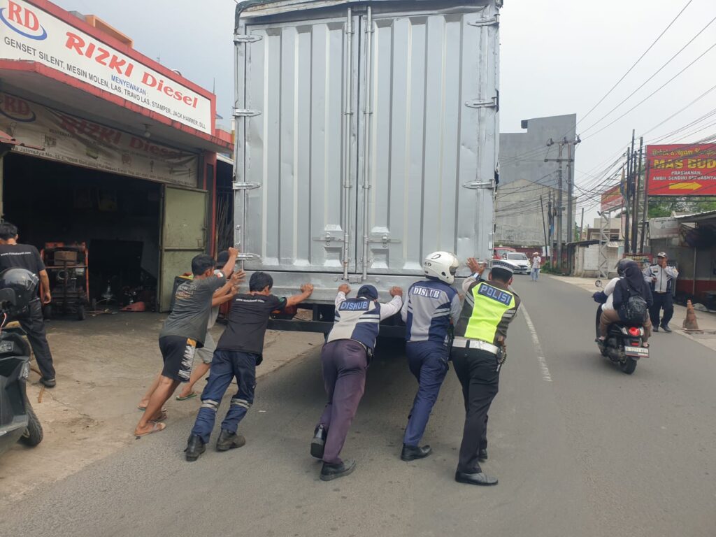 BEKASI – Anggota Unit Lantas Polsek Rawa Lumbu bersama personel Dinas Perhubungan dengan sigap membantu masyarakat yang kendaraannya mogok di Jalan Raya Jatimulya, Bekasi Timur, pada Selasa (4/11/2025).