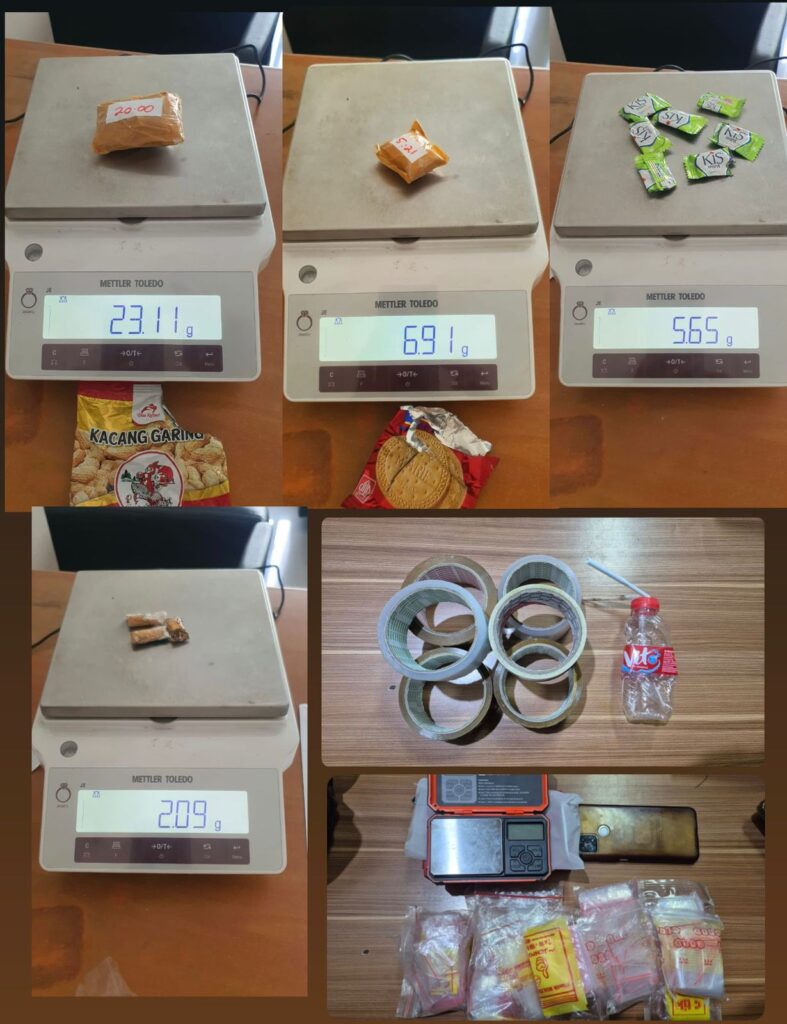 – 23,11 gram sabu dalam plastik klip yang disembunyikan dalam bungkus kacang.